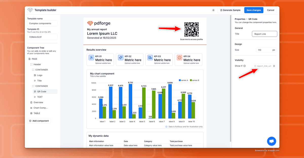 1. Design Your Template: Use pdf noodle’s template builder to create your PDF layout, adding text, images, and the QR code component.